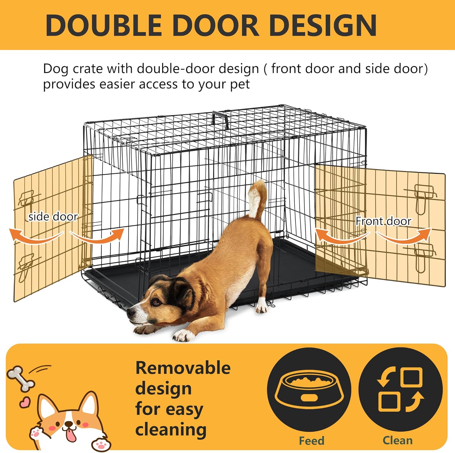 This dog cage dog crate is a warm haven that your pet will adore, not simply a place to imprison them. The powder-coated black metal frame is strong enough to resist even the most voracious chewers, yet it also lets in plenty of air and keeps your dog feeling safe. It's effortless to engage with your dog or arrange the crate in the most convenient location in your home thanks to the double doors with safe locks that provide easy access from the front or side. A detachable plastic tray within gathers spills and simplifies cleanup. The kennel folds down fully for convenient storage or transportation after fun, making it ideal for travel or adventures with your pet.