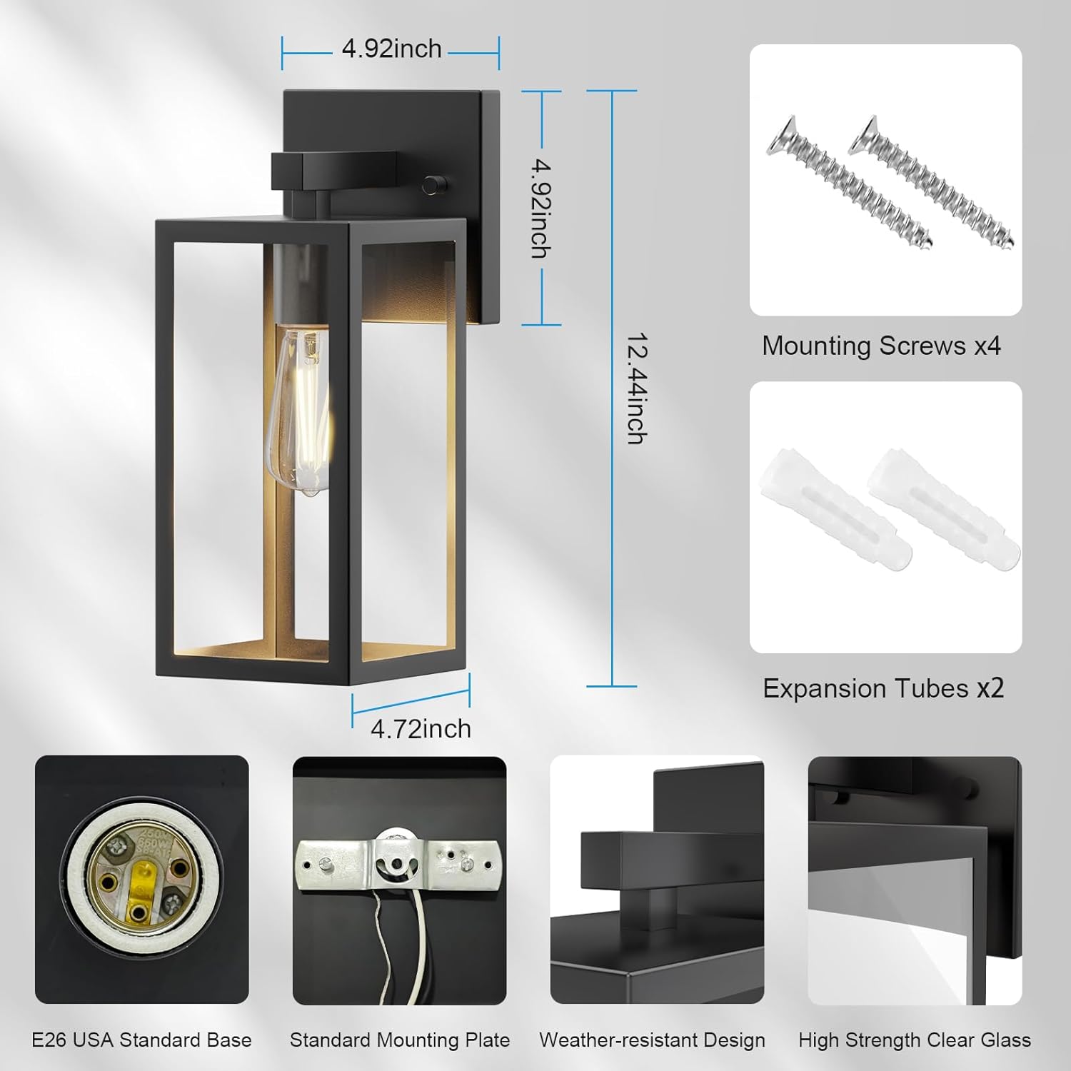 Outdoor Wall Lights, 12.4 Inch Waterproof Lanterns with Frame and Clear Glass Shade, Exterior Front Porch Lights Matte Black Wall Sconce, Modern Mounted Lighting for Patio Entryway Hallway, 2 Pack
