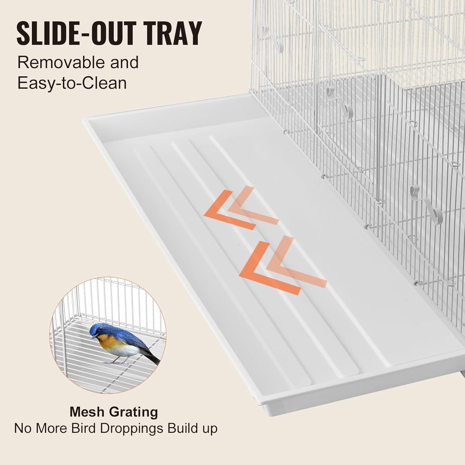 The birdcage with a large space of 30x18x18 inches, is sturdy and stable in structure. It features a secure door design, making it easy for you to open and close the cage, which is helpful for daily feeding, cleaning, and management. The cage provides a secure and healthy home for birds.