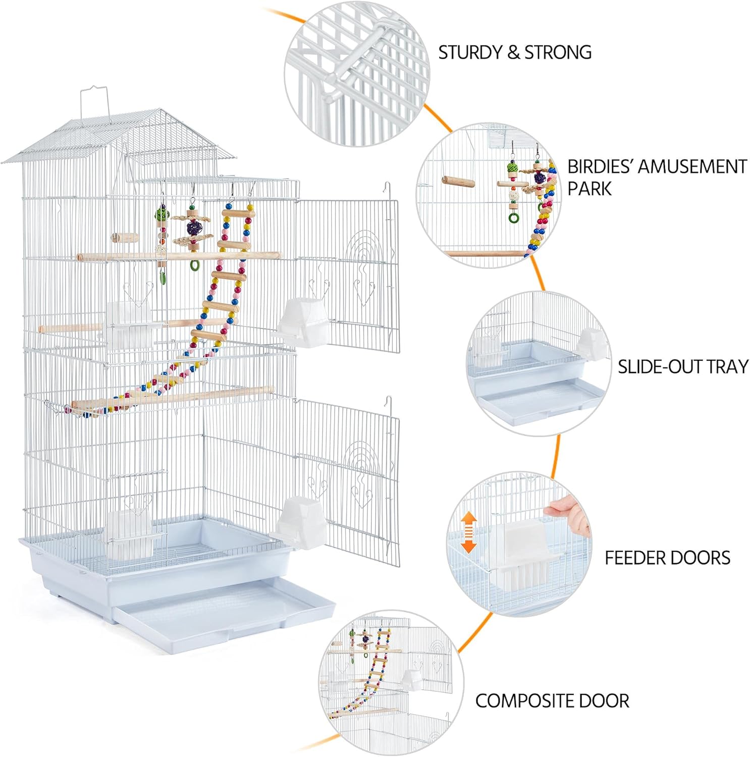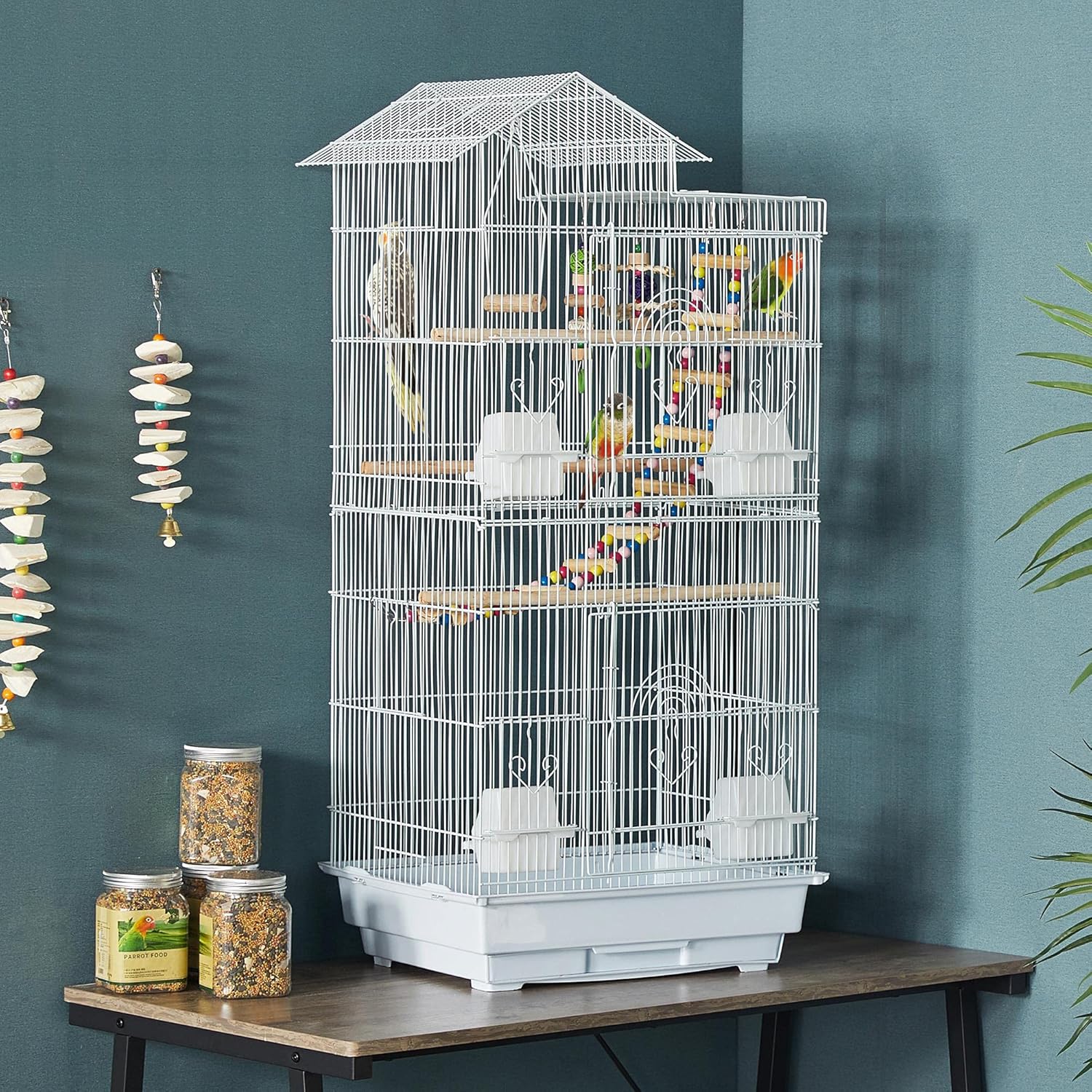 Yaheetech 39-inch Roof Top Medium Parakeet Bird Cages for Cockatiels Conures Finches Budgies Canaries Lovebirds Parakeets Green Cheek Small Birds Parrots, Travel Flight Birdcage w/Toys, White